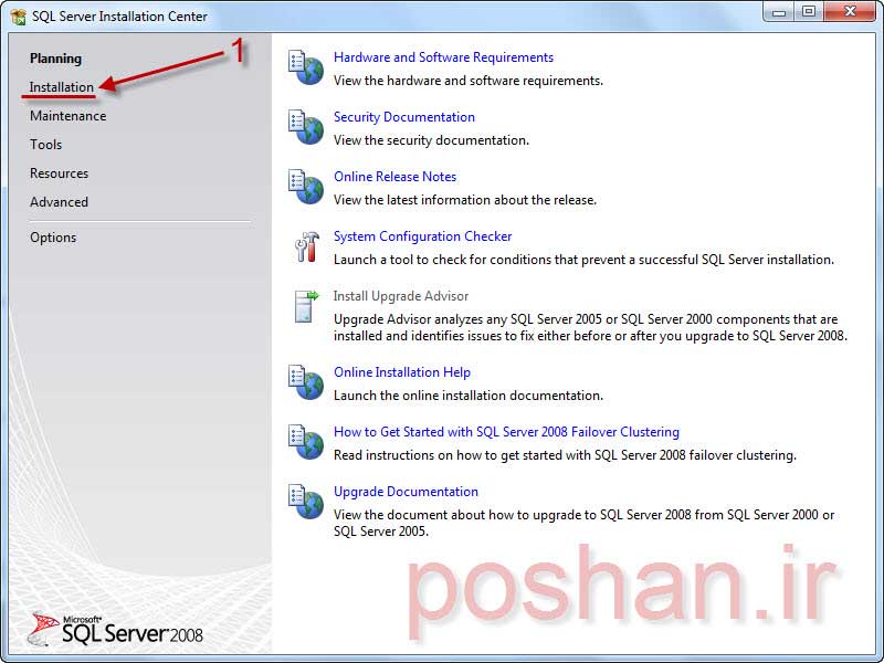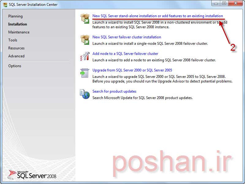 در سمت راست صفحه از بالا گزينه اول براي نصب sql با نمونه جديد آن كليك نماييد.