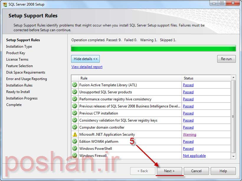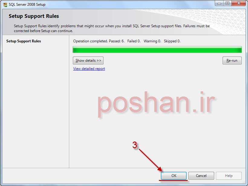 در اين صفحه امكان نصب شدن sql بر روي سيستم شما را مي گويد در بالاي صفحه تعداد خطاها و هشدارها را نمايش مي دهد كه مي توانيد براي ديدن جزئيات بر روي Show details كليك نماييد. در صورتي كه امكان نصب بر روي سيستم شما وجود داشته باشد مي توانيد بر روي OK كليك نماييد.