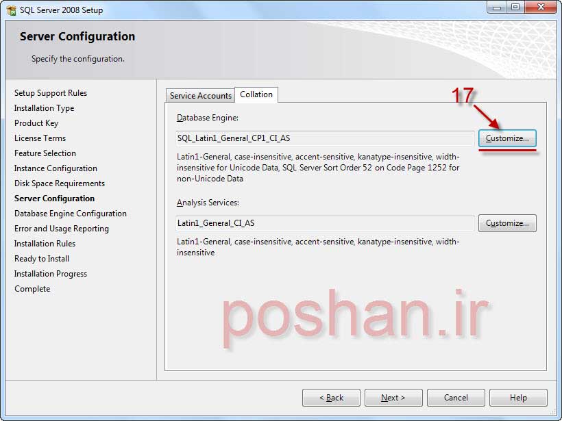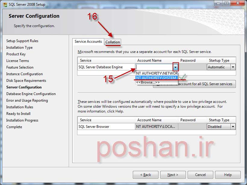 در اين صفحه مشخص مي كنيد كه سرويسهاي Sql با چه حساب كاربري كار كنند. دقت كنيد كه Startup Type بر روي Automatic قرار داشته باشد.