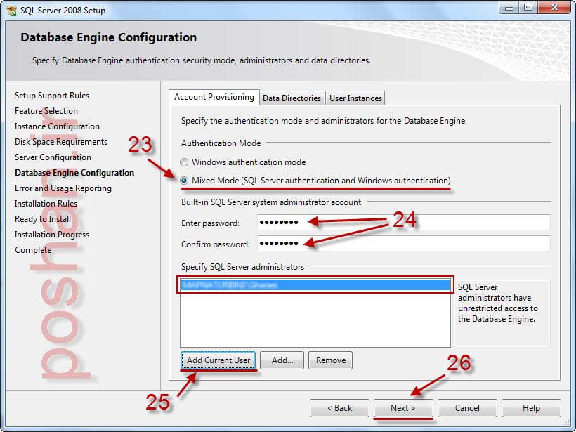 بعد از اينكه مرحله 23 را انتخاب نموديد در مرحله 24 بايد يك رمز وارد نماييد دقت نماييد كه اين رمز در ابتداي نصب نرم افزار به عنوان رمز عبور سرور از شما پرسيده خواهد شد.