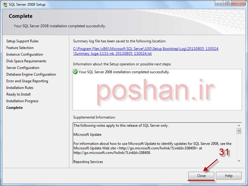 در اين صفحه پيغام موفقيت نصب را نمايش مي دهد. بر روي Close كليك كنيد تا از نصب خارج شويد. سپس كامپيوتر خود را مجددا راه اندازي نماييد يا Restart نماييد.